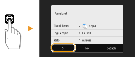 <Monitor. stato>  <Lavoro copia/stampa>  Selezionare il documento copiato nella scheda <Stato lav. copia/stampa>  <Annulla>  <Sì>
