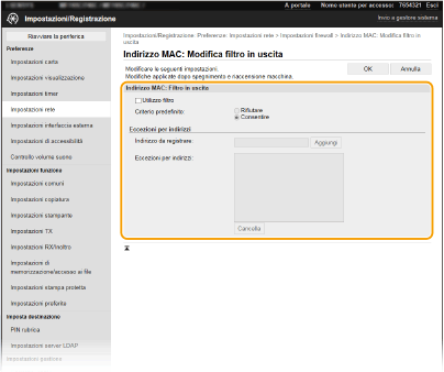 2 | Specificare eccezioni di indirizzo. Immettere l'indirizzo MAC nella casella di testo [Indirizzo da registrare] e fare clic su [Aggiungi]. Non è necessario delimitare gli indirizzi con trattini o due punti. ![]() Verificare errori immissione Se gli indirizzi MAC sono immessi in modo non corretto, potrebbe non essere possibile accedere alla macchina dalla IU remota; in questo caso è necessario impostare <Filtro indirizzi MAC> su <Off>. <Filtro indirizzi MAC> ![]() Quando si seleziona [Rifiutare] per un filtro in uscita I pacchetti in uscita multicast e broadcast non possono essere filtrati. Eliminazione di un indirizzo MAC dalle eccezioni Selezionare un indirizzo MAC e fare clic su [Cancella]. ![]() | ||||