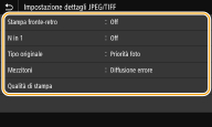 <Qualità di stampa> È possibile modificare le impostazioni correlate alla qualità di stampa. ![]() <Densità> Regola la densità per la stampa. <Risparmio toner> Selezionando <On> le stampe vengono eseguite in modalità risparmio del toner. Selezionare <On> per controllare il layout o altre caratteristiche estetiche prima di procedere alla stampa finale di un lavoro di grandi dimensioni. ![]() Quando <Risparmio toner> è impostato su <On>, <Densità> non è disponibile. |