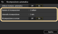 <Utilizzo ricompos. automatica> <Off> <On>  <Numero di ricomposizioni> Da 1 a 2  a 10 (@ volta/e) <Intervallo ricomposizione> Da 2  a 99 (min.) <Ricomposizione se errore> <Off> <On>  |