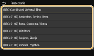 Impostare <Fuso orario> prima di impostare data e ora correnti. Se si modifica l'impostazione <Fuso orario> in un secondo momento, vengono modificate di conseguenza anche data e ora correnti. |