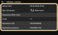 L'indirizzo IP non è configurato correttamente se viene visualizzato come "0.0.0.0". La connessione della macchina a un bridge o hub di commutazione può non riuscire anche se l'indirizzo IP è configurato correttamente. Questo problema può essere risolto impostando un intervallo prima che la macchina inizi la comunicazione. Impostazione di un tempo di attesa per la connessione a una rete È possibile stampare un elenco delle impostazioni di rete correnti. Elenco dati utente/Elenco dati gestore sistema |