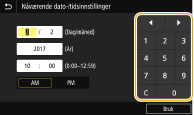 VerdiområdeVerdiene i ( ) vist under inntastingsboksen er området for gyldige verdier for inntasting. Når andre knapper enn talltastene visesNår <+>/<-> eller / vises, kan du trykke på knappene og øke eller redusere tallverdien, eller flytte markøren. |