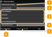 Når du velger <Statusoverv.>, vises et skjermbilde som lar deg sjekke fremdriften for dokumenter som skrives ut, sendes eller mottas, samt statusen til maskinen og informasjon om nettverksinnstilling.