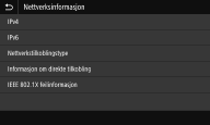 Viser nettverksinnstillingene, for eksempel maskinens IP-adresse, og status, for eksempel tilstanden til trådløs LAN-kommunikasjon.