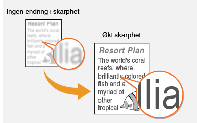 Du kan justere skarpheten for det kopierte bildet. Øk skarpheten for å få skarpere tekst og linjer, eller reduser skarpheten for å forbedre utseendet til fotoer fra ukeblader.