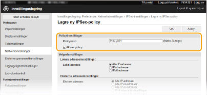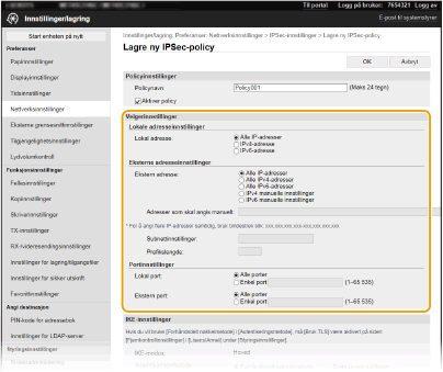 Hvis [IPv4 manuelle innstillinger] eller [IPv6 manuelle innstillinger] er valgt for [Ekstern adresse], angir du IP-adressen for å aktivere policyen. Du kan også angi et område med adresser ved å sette inn en bindestrek mellom adressene.