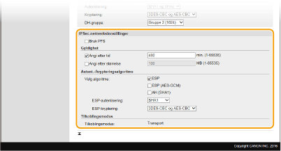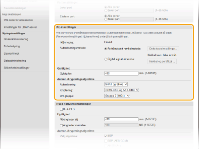 Angi innstillingene for AH/ESP, som leges til i pakker under IPSec-kommunikasjon. AH og ESP kan brukes samtidig. Du kan også velge om du vil aktivere PFS for økt sikkerhet.