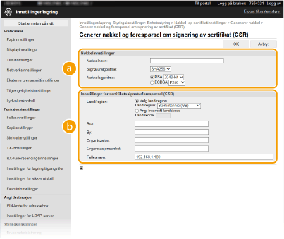 Ettersom sertifikater som genereres på maskinen ikke har en CA-signatur, kan en kommunikasjonsfeil oppstå avhengig av enhetene den kommuniserer med. For at sertifiseringsinstansen skal tildele sertifikatet med CA-signatur, må du innhente data for CSR (forespørsel om sertifikatsignering), som administratoren kan generere fra Fjernkontroll. Når sertifikatet er tildelt, registrerer du det i nøkkelen med det CSR-genererte sertifikatet.