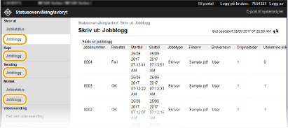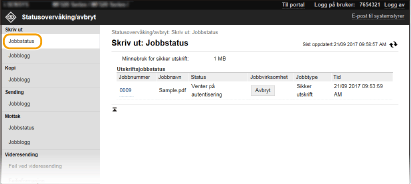 Alle dokumenter som skrives ut, og som venter på å bli skrevet ut, vil bli oppført, uavhengig av innstillingen for avdelings-ID-styring. Hvis du tastet inn brukernavnet ditt under pålogging i Generell bruker-modus, vises brukernavnet bare på dokumentene du har skrevet ut. Klikk på [Jobbnummer] på sikre dokumenter og dokumenter som er midlertidig stanset, for å vise detaljert informasjon. Du kan kontrollere brukernavnet og sideantallet for det utskrevne dokumentet. |