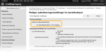 [Bruk enhetsspesifikk autentiseringsinformasjon, og ikke vis autentiseringsskjermen] | Ingen autentiseringsskjermbilde vises når e-poster eller I-fakser sendes. Autentisering på SMTP-serveren utføres med brukernavnet og passordet angitt i [Innstillinger for e-post/I-Fax] Konfigurere kommunikasjonsinnstillinger for e-post/I-faks. |