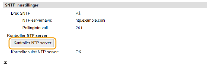 Teste kommunikasjon med NTP-/SNTP-serverenDu kan vise kommunikasjonstatusen for den registrerte serveren ved å klikke på [Innstillinger/lagring] [Nettverksinnstillinger] [Kontroller NTP-server] i [SNTP-innstillinger]. Hvis en ordentlig tilkobling er opprettet, vises resultatet som vist nedenfor. Legg merke til at denne operasjonen ikke justerer systemklokken.![]() |