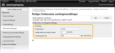 2 | Merk av for [Varsle], og angi de nødvendige innstillingene. ![]() [Varsle] Merk av i boksen for å varsle enhetsbehandlingsprogramvaren om strømstatusen for maskinen. Når [Varsle] er valgt, kan du forvente at maskinen unngår unødvendig kommunikasjon under dvalemodus og reduserer det totale strømforbruket. [Portnummer] Endre portnummeret for denne funksjonen i henhold til nettverksmiljøet. [Antall rutere som skal krysses] Angi hvor mange rutere varselspakkene kan passere gjennom. [Varslingsintervall] Angi hvor ofte maskinen skal varsle enhetsbehandlingsprogramvaren om strømstatusen. |