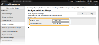 | | Server Message Block (SMB) er en protokoll for deling av ressurser, for eksempel filer og skrivere, med flere enheter på et nettverk. Maskinen bruker SMB til å lagre skannede dokumenter i en delt mappe. Alt etter hvilket nettverk du bruker, må du kanskje angi NetBIOS-navnet og navnet på arbeidsgruppen. |