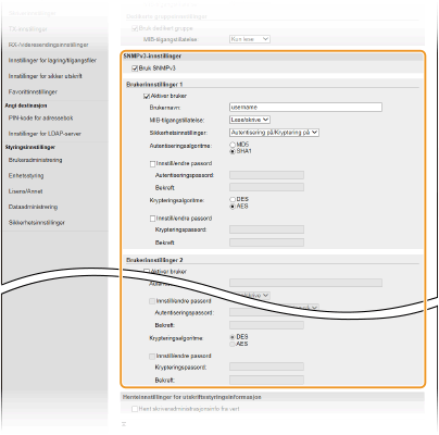 Simple Network Management Protocol (SNMP) er en protokoll for å overvåke og kontrollere kommunikasjonsenheter på et nettverk ved å bruke Management Information Base (MIB). Maskinen støtter SNMPv1 og SNMPv3 med forbedret sikkerhet. Du kan kontrollere statusen for maskinen fra en datamaskin når du skriver ut dokumenter, eller du kan bruke Fjernkontroll. Du kan aktivere SNMPv1 eller SNMPv3, eller begge deler samtidig. Angi innstillingene for hver versjon slik at de passer til nettverksmiljøet og bruksformålet.