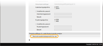 Velg [Autentisering på/Kryptering på], [Autentisering på/Kryptering av], eller [Autentisering av/Kryptering av] for ønsket kombinasjon av godkjennings- og krypteringsinnstillinger.