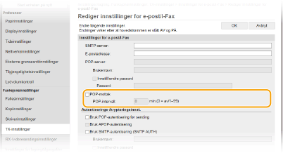 Dette stiller inn intervallet (i minutter) som brukes for automatisk tilkobling til POP3-serveren. Hvis det er noen I-faksdokumenter på serveren, blir de automatisk mottatt og skrevet ut.