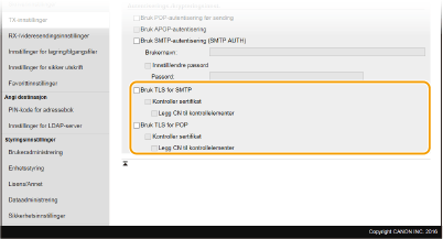 Merk av i boksen hvis du vil bruke TLS til å kryptere kommunikasjon med SMTP-serveren. Merk av for [Kontroller sertifikat] eller [Legg CN til kontrollelementer], alt etter hva du har behov for.