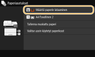 Kun oletuspaperiasetus on tallennettu, paperiasetusnäyttöä ei näytetä, kun paperia lisätään, ja samaa asetusta käytetään aina. Jos lisäät erilaista paperikokoa tai -tyyppiä vaihtamatta paperiasetuksia, laite ei ehkä tulosta oikein. Voit välttää tämän ongelman valitsemalla <Määritä paperin lataaminen> vaiheessa 3 ja lisäämällä sitten paperin. |