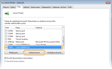 Port MFNP můžete přidat pouze tehdy, když jste nainstalovali ovladač z dodaného disku CD-ROM/DVD-ROM nebo když jste stáhli a nainstalovali ovladač tiskárny nebo ovladač faxu z webu společnosti Canon.
