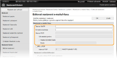 Ke konfiguraci podrobných nastavení odesílání a příjmu, například nastavení pro použití zařízení k odesílání a příjmu i-faxů, nastavení ověřování POP a šifrování komunikace před odesláním e-mailů nebo i-faxů, použijte Vzdálené uživatelské rozhraní. Informace o požadovaných nastaveních získáte od poskytovatele připojení nebo správce sítě.