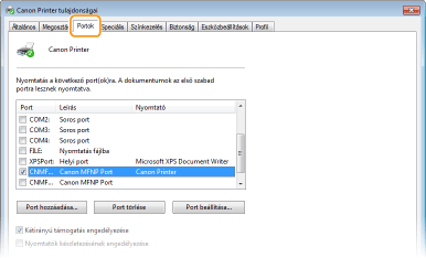 Ha a kiválasztott port [Leírás] mezőjében a [Canon MFNP Port] szerepel, a készülék és a számítógép pedig ugyanazon az alhálózaton van, akkor a kapcsolat megmarad. Nem kell hozzáadnia új portot. Ha a [Szabványos TCP/IP-port] szerepel, hozzá kell adnia egy új portot. Nyomtatóportok konfigurálása
