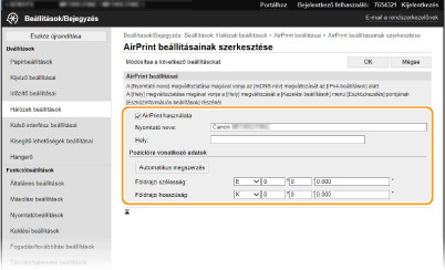 Megadhatja, hogy a nyomtatás és faxküldést az AirPrint-tel szeretné-e végezni. A gyári alapbeállítás: <Be>.