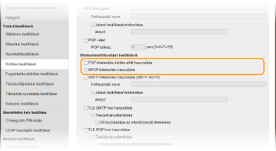 Ha a POP3-kiszolgálót kívánja használni az e-mail és i-fax küldését megelőző hitelesítéshez, jelölje be a jelölőnégyzetet.