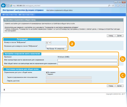 Настройка SMB). Чтобы настроить аппарат для сохранения сканированных документов в общую сетевую папку посредством протокола SMB, заранее укажите расположение общей папки на компьютере. В этом разделе описывается порядок задания места сохранения с помощью программы Инструмент настройки функции отправки.