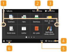 Nospiediet, lai pārbaudītu drukāšanas statusu, skatītu lietojuma vēsturi vai dažādus tīkla iestatījumus, piemēram, iekārtas IP adresi. Varat arī skatīt iekārtas statusu, piemēram, atlikušo papīra daudzumu un tonera daudzumu kasetnēs, kā arī to, vai radušās kļūdas. Ekrāns <Statusa pārraudzība>