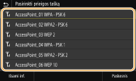 Galite ieškoti belaidžių maršrutizatorių (arba prieigos taškų), prie kurių galima prisijungti, ir pasirinkti vieną iš rodomų aparato ekrane. Kaip tinklo raktą įveskite WEP raktą arba PSK. Prieš pasirinkdami belaidį maršrutizatorių, patikrinkite ir užsirašykite reikalingą sąrankos informaciją, įskaitant SSID ir tinklo raktą (