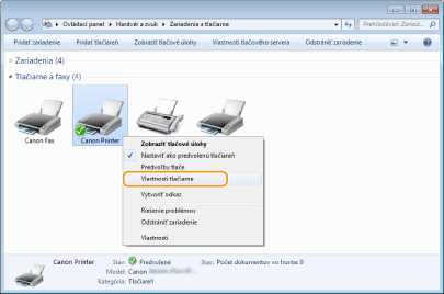 Kliknite pravým tlačidlom myši na ikonu ovládača tlačiarne tohto zariadenia a potom kliknite na položku [Vlastnosti tlačiarne] alebo [Vlastnosti].
