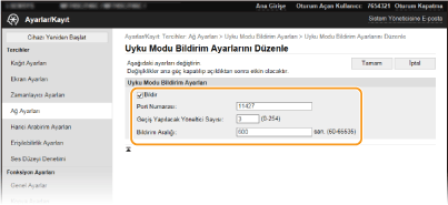Aygıt yönetimi yazılımına makinenin güç durumunu bildirmek için onay kutusunu seçin. [Bildir] seçildiğinde, makinenin uyku modundayken gereksiz iletişimi önlemesini ve toplam güç tüketiminin azaltılmasını bekleyebilirsiniz. [Port Numarası]
