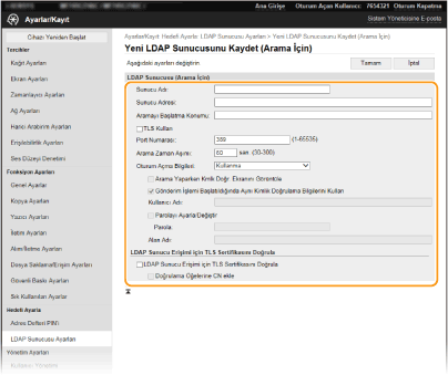 Ağda bir LDAP sunucusu başlatılırsa, sunucuda faks numaraları veya e-posta adresleri arayabilir ve ardından bunları hedef olarak belirtebilir ya da Adres Defterine kaydedebilirsiniz. Gönderme işlevi kimlik doğrulaması ( LDAP Sunucusu Kimlik Doğrulaması) etkinleştirilmişse, kimlik doğrulaması için kullanılan sunucuyu kaydetmeniz gerektiğini de unutmayın. Her biri arama ve kimlik doğrulaması için olmak üzere makineye en fazla beş LDAP sunucusu kaydedebilirsiniz. Uzak Kullanıcı Arabirimi aracılığıyla LDAP sunucularını kaydedin.