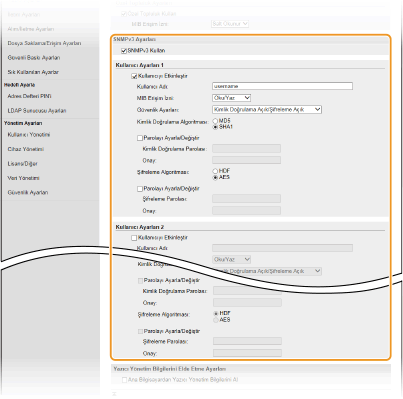 Basit Ağ Yönetimi Protokolü (SNMP), Yönetim Bilgi Tabanı (MIB) kullanılarak bir ağdaki iletişim aygıtlarını izleme ve kontrol etme protokolüdür. Makine, SNMPv1'i ve güvenliği geliştirilmiş SNMPv3'ü destekler. Belgeleri yazdırırken veya Uzak Kullanıcı Arabirimini kullanırken bir bilgisayardan makinenin durumunu kontrol edebilirsiniz. SNMPv1 veya SNMPv3'ü ayrı ayrı veya her ikisini de aynı anda etkinleştirebilirsiniz. Her bir sürümün ayarlarını, ağ ortamınıza ve kullanım amacınıza uyacak şekilde belirtin.