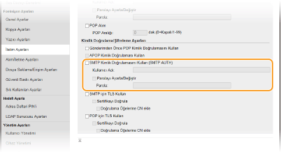 SMTP kimlik doğrulamasını (SMTP AUTH) yapılandırırsanız, e-posta veya I-Faks gönderimi esnasında kullanıcı adı ve parola ile kullanıcı kimliği belirlemesi yapılır.
