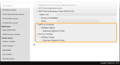 SMTP sunucusu ile iletişim şifrelemesi için TLS'yi kullanmak üzere onay kutusunu seçin. Gereksinimlerinize bağlı olarak [Sertifikayı Doğrula] veya [Doğrulama Öğelerine CN ekle] onay kutusunu seçin.