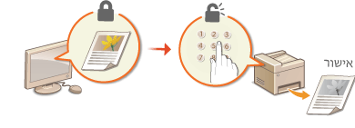 אם תקבע PIN בעת הדפסה של מסמך ממחשב, המסמך ישמר בזיכרון המכשיר ולא יודפס עד להזנת ה-PIN הנכון בלוח ההפעלה של המכשיר. הפונקציה נקראת "הדפסה מאובטחת", והמסמך המוגן באמצעות PIN נקרא "מסמך מאובטח". שימוש בהדפסה מאובטחת מונע השארת תדפיסים של מסמכים סודיים ללא השגחה.