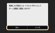 <はい>を選んだときは、メッセージが表示されます。内容を確認し、<OK>を選ぶと、登録した設定のボタンがホーム画面に追加されます。