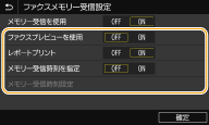 受信文書をメモリーに保存するには<メモリー受信を使用>を<ON>にします。受信文書のプレビューをリモートUIで確認できるように設定することもできます。また、指定した時間帯だけメモリー受信させることもできます。