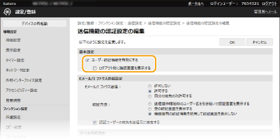 ファクスやスキャン機能を使うときに認証送信のログイン画面を表示する(LDAPサーバーで認証を行う)ときはチェックマークを付けます。