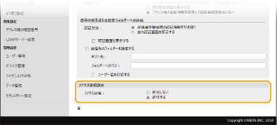 ファクスの送信を許可するかどうかを設定します。[許可しない]に設定すると、ファクス機能は使用できなくなります。