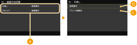 • <手差し> <速度優先> <プリント面優先> • <カセット1> <速度優先> <プリント面優先> • <カセット2>*1 <速度優先> <プリント面優先> • <カセット3>*1 <速度優先> <プリント面優先> • <カセット4>*1 <速度優先> <プリント面優先> |