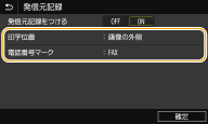 • <発信元記録をつける> <OFF> <ON> <印字位置> <画像の内側> <画像の外側> |