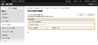 NTPサーバー(NTPv3)とSNTPサーバー(SNTPv3およびv4)の両方に対応しています。 リモートUIから本機を設定するときの基本操作は、本機の設定を変更するを参照してください。 |