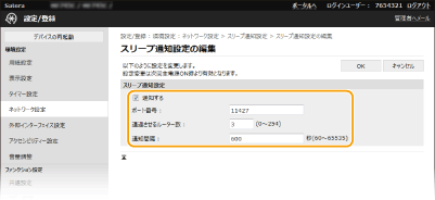 2 | [通知する]にチェックマークを付け、必要な情報を入力する ![]() [通知する] チェックマークを付けると本機の電源状態がデバイス管理ソフトウェアに通知されます。節電状態中における無駄な通信の削減や、総消費電力の抑制などの効果が期待できます。 [ポート番号] 管理ソフトウェアとのSLP通信で使用するポート番号を入力します。 [通過させるルーター数] SLP通信パケットが最大で何台のルーターを通過できるかを指定します。 [通知間隔] 何秒おきに本機の電源状態を通知するかを入力します。 |