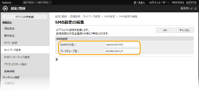 | | SMBは、ネットワーク内の複数デバイス間でファイルやプリンターを共有するためのプロトコルで、本機ではスキャンした文書を共有フォルダーに保存するときなどに使用します。お使いのネットワーク環境によっては、NetBIOS名とワークグループ名の設定が必要です。 |