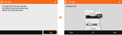 Thông báo được hiển thị trên màn hình trong các tình huống như khi hết giấy hoặc khi tuổi thọ của hộp mực đã tới hạn. Để biết thêm thông tin, vui lòng xem "Xử lý Sự cố (FAQ)" trên trang web hướng dẫn sử dụng trực tuyến.