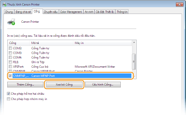 1 | Chọn tài liệu mà bạn muốn xóa, và nhấp vào [Xoá bỏ Cổng]. ![]() ![]() Bạn không thể xóa cổng hiện đang được cấu hình là cổng máy in. Để xóa cổng này, chọn một cổng khác và nhấp vào [Áp dụng] để định cấu hình nó làm cổng máy in mới, và sau đó xóa cổng ban đầu. |