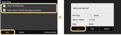 Jika anda ingin membatalkan penyalinan serta-merta selepas memilih <Mula>, pilih <Batal> pada skrin atau tekan